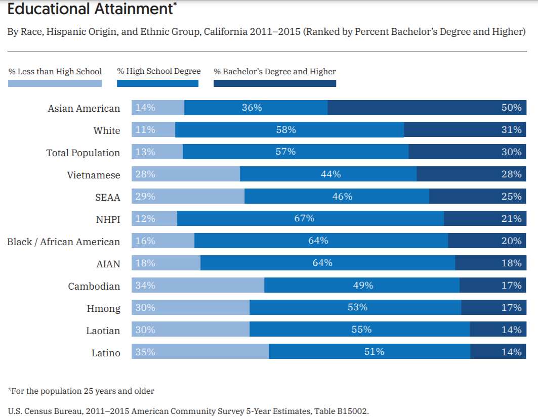 东南亚裔持续面临获得教育机会的挑战。与白人和作为整体的亚裔相比,东南亚裔在多个教育程度指标(高中毕业、大学入学和大学完成)上明显偏低。近 30% 的东南亚裔没有完成高中教育或通过高中毕业考试,这一比例是全国平均水平 (13%) 的两倍多。在东南亚裔族群中,柬埔寨裔拥有高中文凭或通过高中毕业考试的可能性最小。此外,只有四分之一的东南亚裔拥有学士或更高学历,与此相比,亚裔作为整体,有一半的人拥有学士或更高学历。在东南亚裔族群中,越裔有高等教育学位的比率最高,有28%,而比率最低的老挝裔只有14%,与拉丁裔持平。