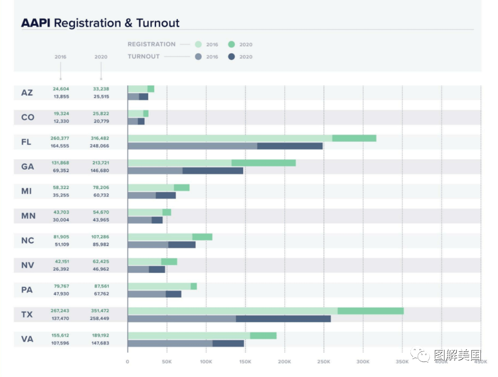 这份报告根据政治数据公司TargetSmart提供的数据,分析了去年在11个战场州投票的6,480万名选民,重点关注面向中期选举的新趋势。报告还对佐治亚州亚裔宣传基金和APIA Nevada这样的基层组织的“宣传方案的影响”的相关数据,进行了评估。