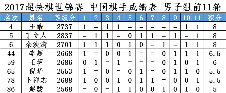 下面是中国棋手的成绩表: