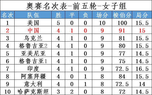 五轮过后,中国男队以四胜一负场分8分,暂列积分榜第十位。