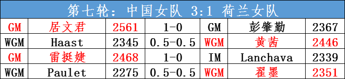 前六轮全胜的阿塞拜疆和波兰本轮激战打平,卫冕冠军美国队本轮大胜克罗地亚队。阿塞拜疆、波兰和美国三队场分同积13分,并列积分榜第一集团。
