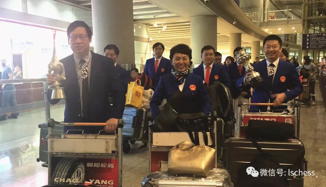 北京时间10月8日下午,在格鲁吉亚巴统举行的第43届国际象棋奥林匹克团体赛上双双夺冠的中国国际象棋男女队载誉归来!