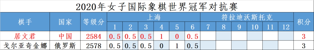 1月12日晚,"中国移动"2020女子国际象棋世界冠军对抗赛晚在上海棋院结束了第六盘棋的争夺。卫冕冠军居文君经过105回合的漫长战斗,弈和挑战者俄罗斯棋手戈尔亚奇金娜。这样,本次世界冠军赛前半程比赛全部结束,双方总比分3比3打平。接下来,战斗将移师俄罗斯符拉迪沃斯托克(海参崴)。