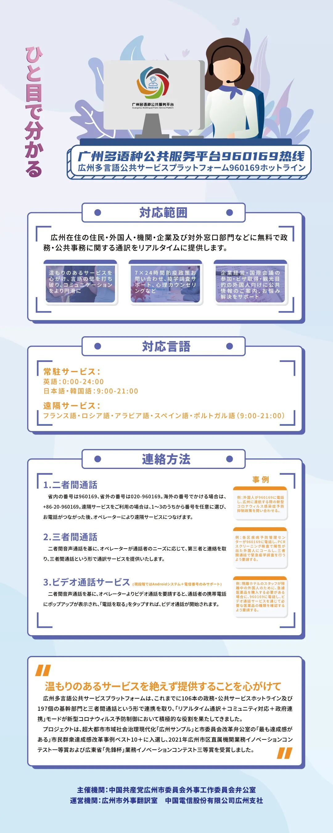在广州多语种公共服务平台上线运营三周年之际,为帮助广大中外群众和基层涉外干部更清晰、直观地了解960169热线的服务范围和使用方法,7月30日上午,广州多语种公共服务平台在广粤国际社区服务中心举办公益宣传微课堂,手把手教外籍人士和各区相关人员如何便利使用音、视频交互服务,并现场向公众发布中、英、日、韩四语版本的“一图读懂960169热线”。