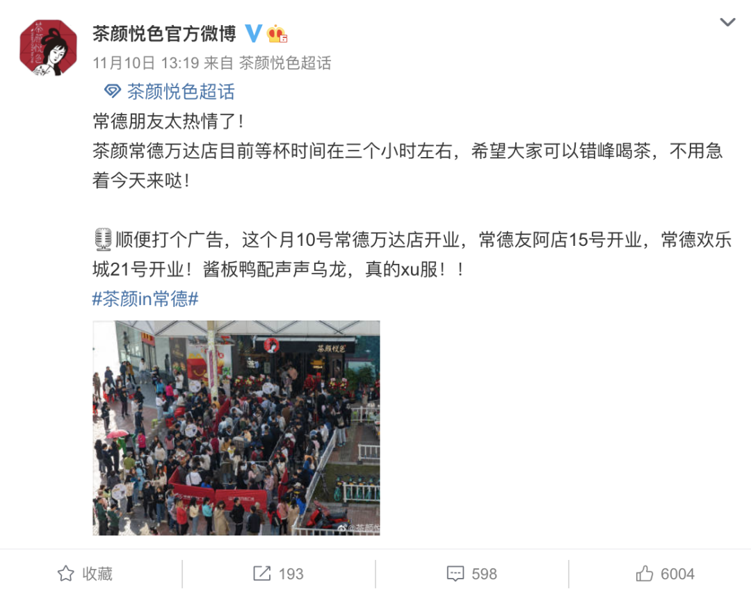 其官方微博表示,开店首日,想要买到一杯茶颜悦色,需要等待三小时左右。同时,向大家发出预告:15日,茶颜悦色在常德的友阿国际广场、常德欢乐城店也将开业。在湖北武汉的门店也计划在12月开出。