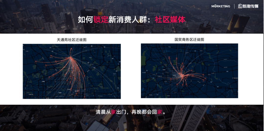 下图是两幅人群迁徙图,左边是早晨北京天通苑的社区迁徙图,右侧是国贸商务区下班后的迁徙图。随着红色光点的流动,大家可以发现白天,消费者都从社区向各个CBD汇集,夜晚大家又从CBD向社区扩散。