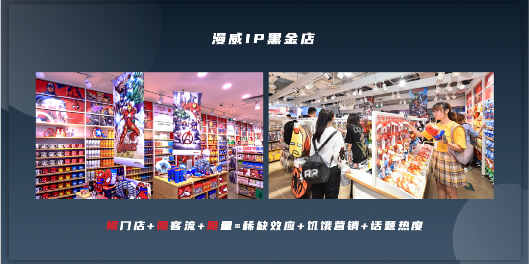 比如上图是名创优品去年5月开第一家漫威IP黑金店,后来中国覆盖了300多家门店。此前名创优品在深圳开了一家王者荣耀的主题店,当时也是非常的火爆。