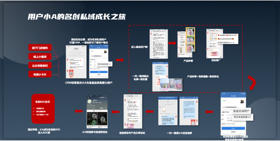 如何去联动IP的粉丝来进行内容的共创,从而实现二次创作?用众包式生产的方式,来生产我们的营销素材。我们有BGC的内容,我们也找了很多的KOL在做PGC的内容,但我们认为更大的体量,更大的活力是在于UGC的内容。比如上图提到的案例,就是一个“粉丝脑洞超乎你想象”的案例。这个案例的发现,来源于我这次来北京,登机前刷小红书的过程中,我发现一个粉丝购买了名创优品最近上新的一款迪士尼反派系列盲盒,他将盲盒跟一本紫禁城的书做了结合,自己加了很多剧情。所以,只要我们对粉丝加以引导,或者用一些激励的机制,粉丝可以帮助我们创造非常有料、有趣的素材。另外在艺人IP二次创作方面——王一博是我们的品牌代言人,在官宣之后,我们利用购物袋让粉丝做二次创作,结果有非常多的用户参与,通过微博后台就有两千位用户提交作品。综上,只有具备自主传播能量的IP,才是真正意义上的IP,我们以上做的一切都是围绕IP内核与粉丝做共鸣、共振、共情,做到后传播效果就是水到渠成。名创优品国内进店客流达10亿+人次,线下流量是个巨大的宝藏。去年,2019年11月,新版小程序会员体系上线,我们开始把线下的用户沉淀至名创优品的线上小程序中。2020年4月开始,基于线上小程序,我们开始试点进行社群运营。到11月份,小程序会员人数已经累计高达3800w+,社群用户300w+,同时社群人数还在以每月50w的速度增长。而经过我们运营之后,MAU平均提升120%,目前通过社群下单的用户每天超过6万人次。那么如何将一个线下公域流量中的用户,转化为我们的私域流量?以下是一个典型用户的“私域”成长之旅。通过我们线下门店的物料、小程序、线上公众号的菜单或电商卡片等方式,导入到我们企业微信当中,成为私域用户,再把他引导进我们一个基础的用户群,给予产品的种草、活动的推广、日常促销信息的推送。另一方面,通过打通我们自己的CRM用户中台,把标签跟企业微信做对接,通过企业微信做精准的触达沟通,让他变得触达更高效,也更精准,经过一段运营之后,再去做分层,把他引入到垂类的社群,或者如果他是高价值用户,我们也会把他放进专门的社群当中去。他来参加社群活动,从中再去挑选一些有内容创作和分发能力的用户进入我们的KOC社群,帮助名创优品做后面的内容营销。而我们也会基于不同的用户进行给予不同的“金字塔”分层。首先,基于门店LBS的基础用户群。对于这部分社群,我们不必执着于或是纠结于他们是不是和我们进行频繁、活跃的互动,有时候他们需要的只是一个信息触达的渠道。对于这部分社群,我们就本本分分做品牌于用户之间沟通的媒介与桥梁即可,定期给他一定的信息触达,我们不必要为他的活跃度而焦虑,但我们也可以偶尔从后台看到他们为我们带来的销售转化与增量。其次,中层的高价值用户同好群。这里面的部分用户可以成为管理员,他们会非常活跃,而且聊的越多,买的越多。最后,重点是顶层的KOC社群。这是真正的“人形种草机”,他们能够帮助我们节省运营成本,为品牌带来更大的口碑和价值传播。以微信生态中的小程序为例。我们通过微信小程序可以得到用户基本信息、小程序浏览记录以及消费数据,这些可以帮助我们沉淀用户标签,而且这些标签是动态变化的,实现最后的精准营销和生意的转化。最后,给大家就社群运营做一个总结,零售行业的私域流量运营除了拉动消费频次以外,还能为我们带来什么?一、倾听高价值用户声音,抓住用户痛点,赋能产品研发;