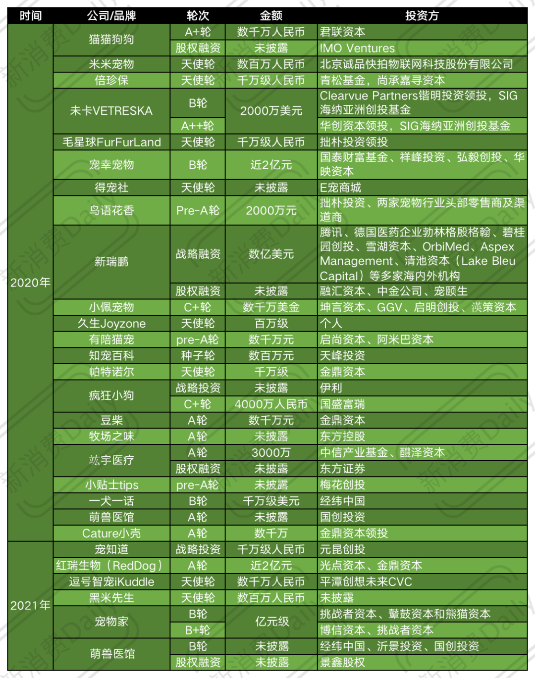 另外,未卡VETRESKA两轮融资金额达到2000万美元,折合人民币超1亿元;宠物家两轮融资亦是亿元级别;而宠幸宠物、新瑞鹏、红瑞生物(RedDog)、小佩宠物等品牌单轮融资金额就已过亿。