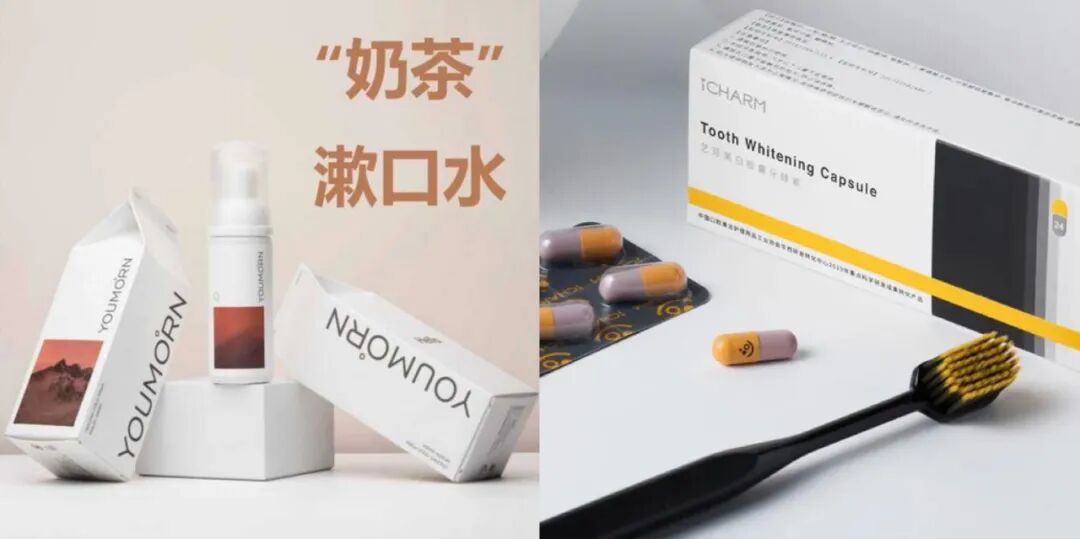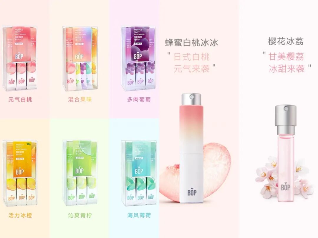 在新消费Daily看来,新锐口腔护理品牌之所以打得火热,原因离不开两点,第一,产品自带高复购于强周期属性,同时新品牌持续进行产品创新,产品趋于美妆化、多功能化;第二,基于“双微一抖+小红书”,营销打法灵活多样。值得注意的是,某种程度上,口腔护理产品相对于其他品来讲,天生具有高复购于强周期属性,类似于牙膏、牙刷等基础类口腔护理产品,一旦成功成功打入消费者洗漱台且得到认可,那么这款幸运的产品便可以得到消费者的长期支持。对于新锐品牌来讲,想要成功突围,就离不开产品的差异化创新。而第一步,是找到更多“被看见”的可能。据新消费Daily观察,市场中的大部分新品牌在产品创新层面,基本会外围产品外观与成分功效这两点进行“突破”,而由于牙刷、电动牙刷的外观比较固定,因此,大部分品牌会选择牙膏、漱口水、牙粉等外观形态更灵活的品类进行创新。至于对于产品层面的创新,主要体现在外观美妆化与成分多元化两方面。《华与华方法论》里说,包装是品牌最大的媒介“包装”是个免费的广告位,而上述大部分新消费品牌,也试图通过包装来进入消费者视线,抢占消费心智。以开篇中提及的「BOP」为例,从其对于自己“新一代口腔美妆化”品牌的定义便不难猜出,「BOP」的产品外观将会区别于传统口腔护理品牌。左:「BOP」一次性漱口水 右:「BOP」口腔喷雾