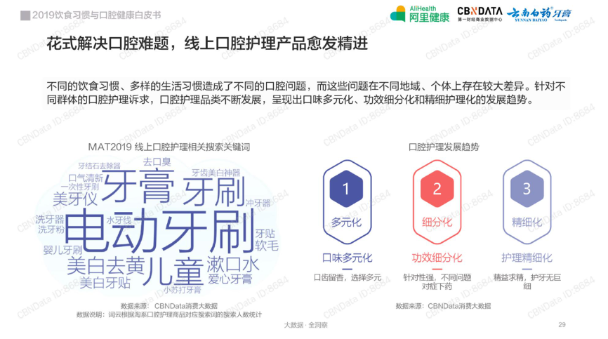 根据Euromonitor数据显示,2020年,我国口腔护理行业市场规模约为71.01亿美元,我国口腔护理市场占全球口腔护理市场规模的14.97%。同时2019年,我国口腔护理行业市场规模为66.91亿美元,较2018年同比增长10.42%,而全球市场增长仅为1.09%;可见,中国口腔护理市场规模在持续扩大。「BOP」创始人也曾表示,近两年,口腔护理很多细分的品类还在快速增长,未来3-5年,口腔护理会成为一个新的千亿级市场。同时,越来越多的新锐品牌正在加入这场消费者的牙齿保卫战,抢滩千亿口腔护理市场。而线上渠道往往是大部分新消费品牌的首选以及主力战场,其零售额与增速也可见一斑。据欧特欧国际咨询公司统计数据显示,2020年全网口腔护理类产品零售额达141.87亿元,同比增长25.7%。另外,据凯度和天猫新品创新中心联合发布的《2020年口腔护理行业最新趋势报告》显示,2020年口腔护理几乎所有主要类目都迎来大增长。(主要类目为:电动牙刷、牙膏、冲牙器、漱口水、牙刷、儿童电动牙刷、儿童牙膏、牙贴、牙线)而开篇提及的「usmile」、「参半」的爆发与火热,就是整个口腔护理市场新品牌现状的影射,近两年,口腔护理赛道吸金不断。据新消费Daily不完全统计,自2019年起,共有10余个口腔护理品牌,完成近18轮融资。新锐代表品牌参半,更是在两年内完成5轮融资。从上图中不难发现,在口腔护理品类中,电动牙刷、牙膏、漱口水等最基本的清洁类产品依旧是资本追逐的热点。市场的火热肯定离不开需求的出现,而带动口腔消费升级的正是新一波主力消费者。值得注意的是,除了那群愿意尝鲜的主力消费群体 Z世代外,小镇青年、精致白领等人群同样在消费着口腔护理产品,对于所有人,牙膏牙刷都是刚需。同时,据CBNData《健康生活消费趋势报告》显示,近年来我国口腔健康的关注度已普遍提高,“口腔问题”对消费者而言已严重影响个人形象,其中72%的消费者认为口腔问题会影响社交自信度,67%的消费者认为口腔问题影响外貌颜值。可见,颜值经济之下,越来越多的消费者开始追求一口好牙,以及一口白牙,疫情的爆发也点燃并加速了人们对于口腔护理等健康问题的高度重视。“新”一代口腔护理产品: