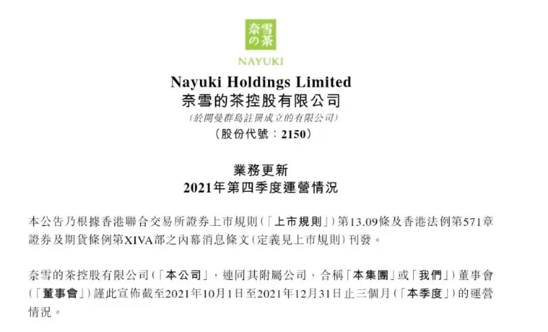 1月7日晚间,“新式茶饮第一股”奈雪的茶发布2021年第四季度运营情况公告。
