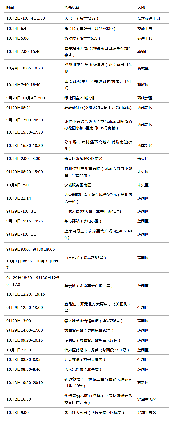 10月4日0-24时,西安市新增12例本土无症状感染者,9例为省外来陕返陕人员,1例为省外来陕返陕同行人员,1例为已诊断病例的密切接触者,1例与省外及省内市外2例已诊断病例基因测序高度同源;其中,8例在集中隔离中发现,4例在社区筛查中发现。经初步流调,病例在隔离管控前涉及的活动轨迹为: