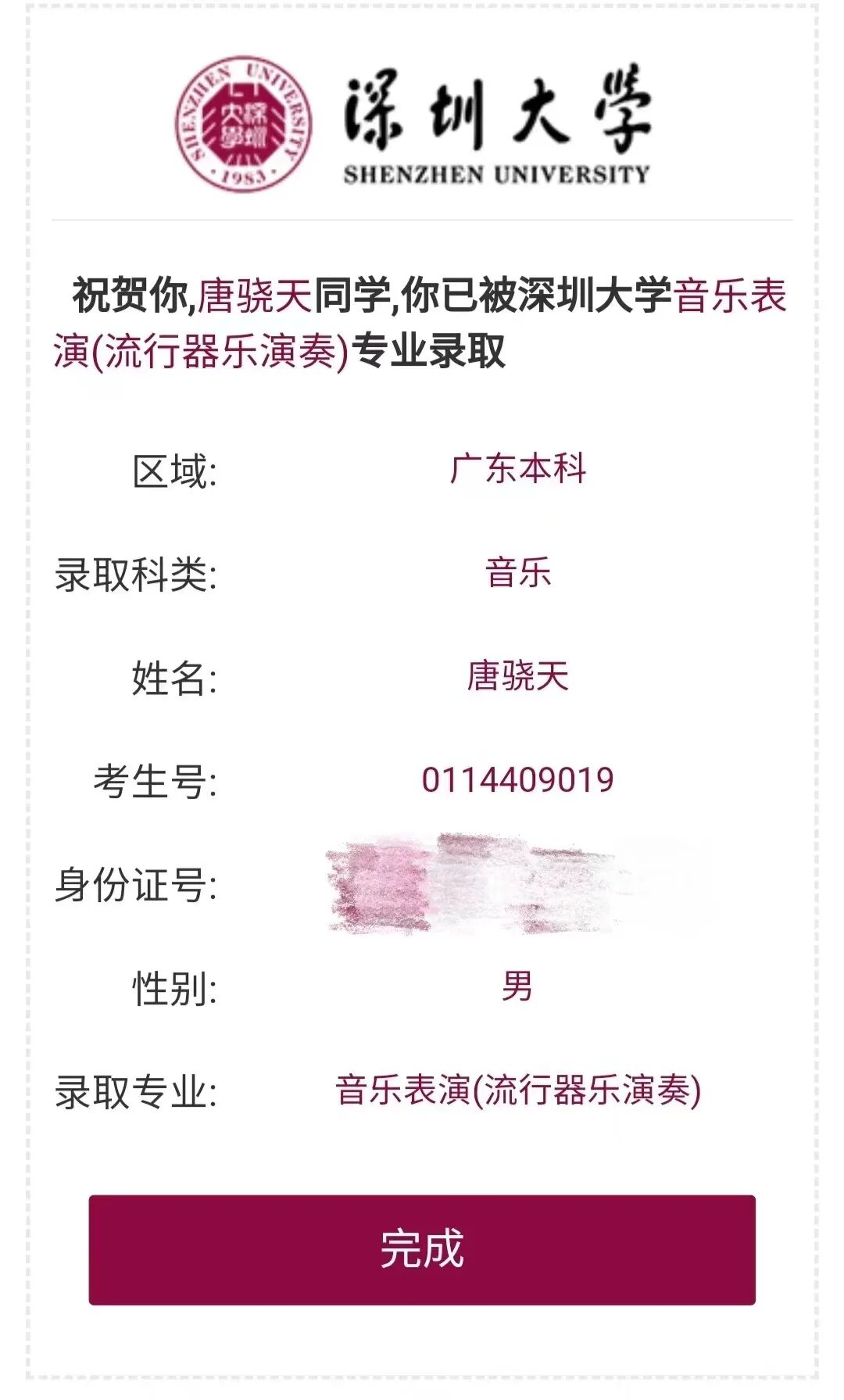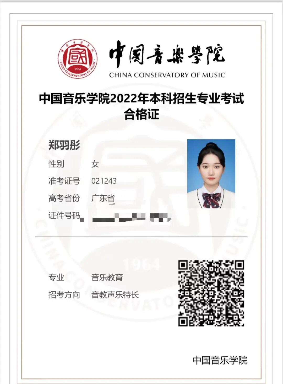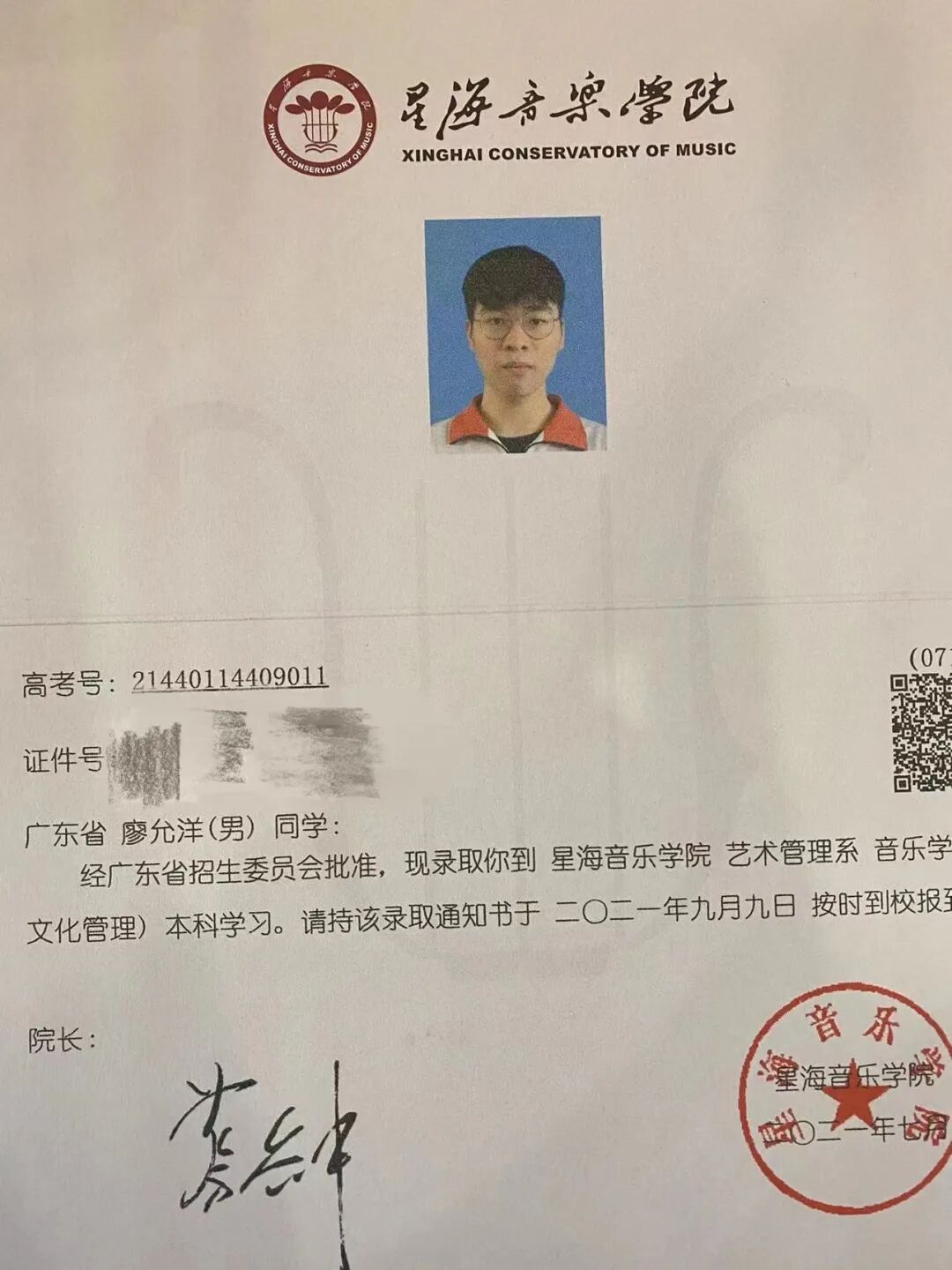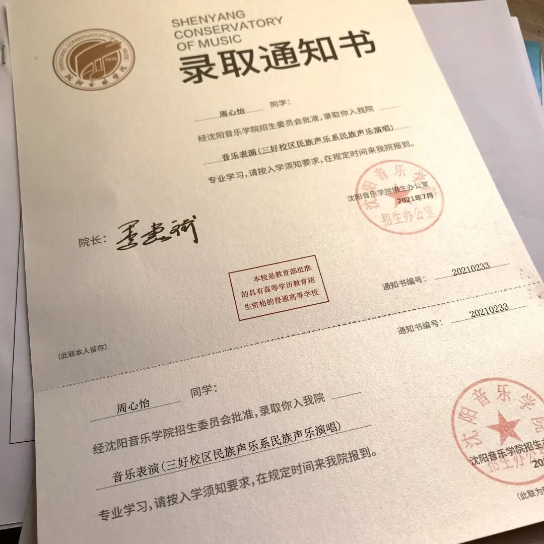 部分音乐生录取通知书