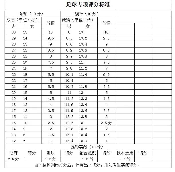 (2)足球:考试穿上号码衣,根据老师指示,作颠球、盘球绕杆、踢定位球、实战对抗等演示,由3位评判老师打分。