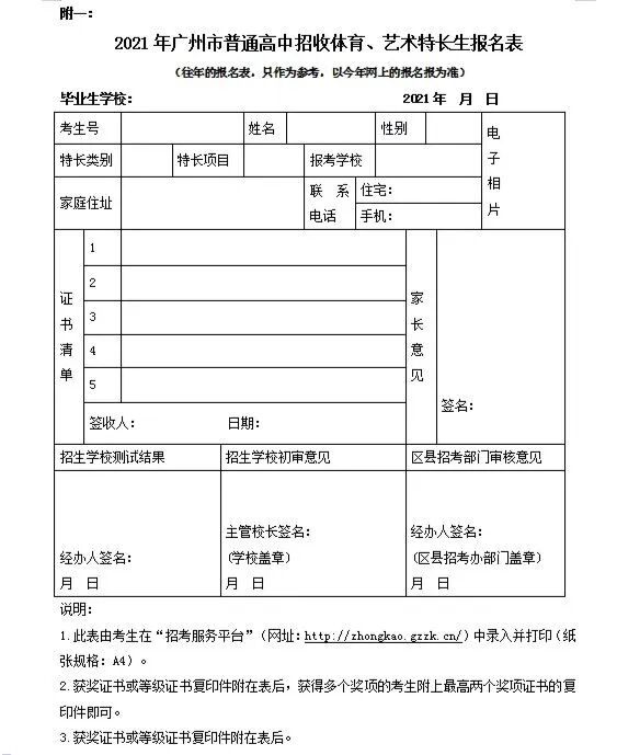 1.网上申报:5月5日-11日,符合体育、艺术特长生招生条件且需要报考的考生,登录广州市高中阶段学校招生考试服务平台(以下简称“中考服务平台”,网址:https://zhongkao.gzzk.cn/)填报获奖项目、获奖等级和证书等级等相关信息,并把所需的审核材料整合为一个pdf文件上传。每名考生只能报考一所对口项目的招生学校。