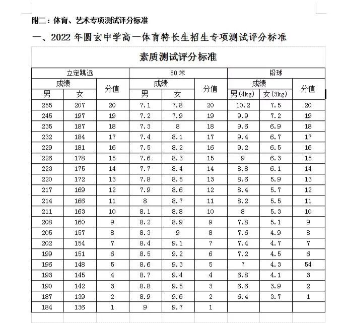 (1)50米测试一次,铅球、立定跳远均测试三次,取最佳成绩。评分标准见《附表》。