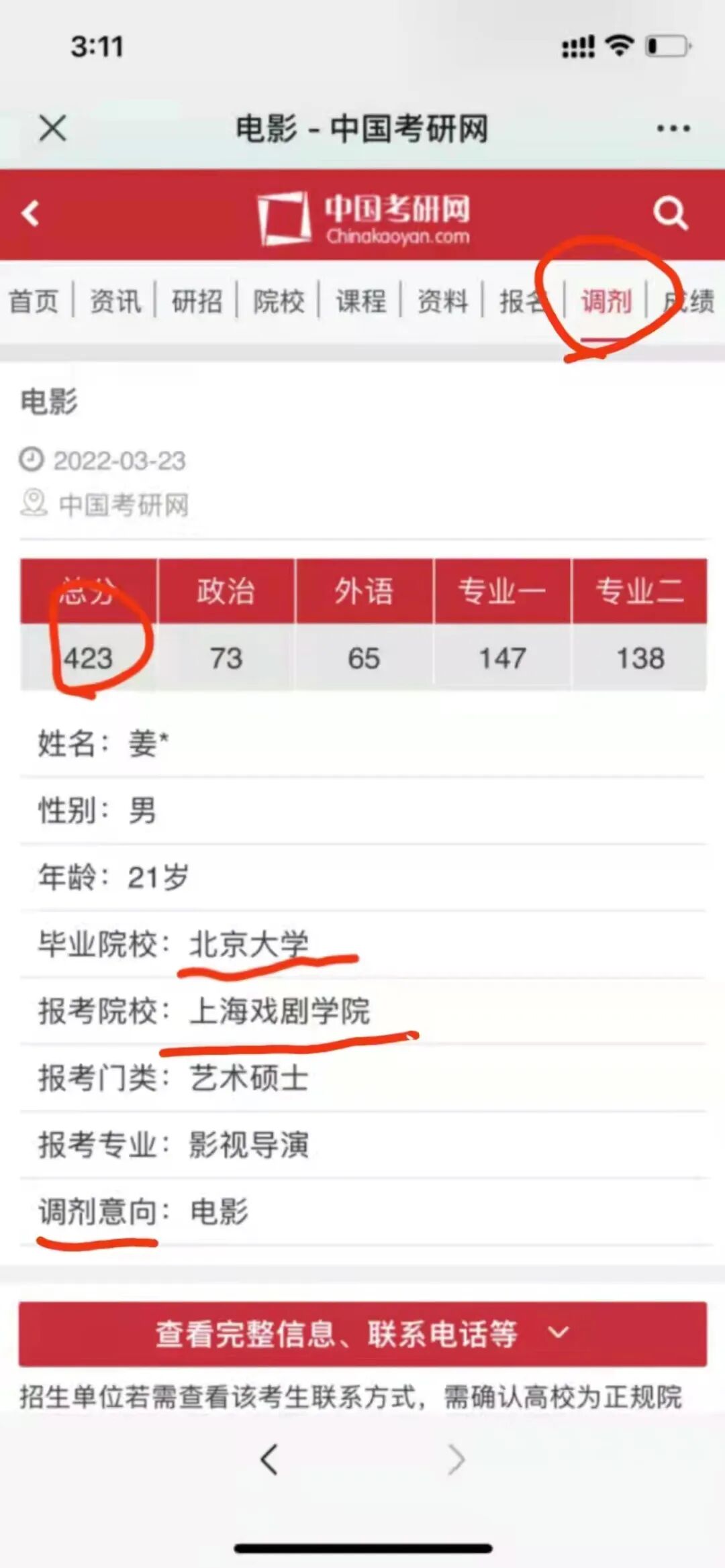 北大本科考上戏,初试423,仍需调剂……