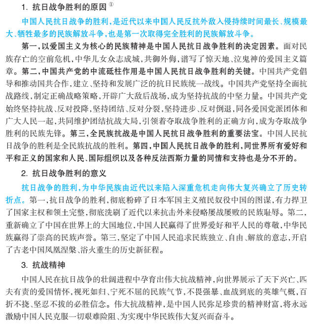🔺抗日战争胜利的意义:彻底粉碎了日本军国主义殖民奴役中国的图谋,有力捍卫了国家主权和领土完整,彻底洗刷了近代以来抗击外来侵略屡战屡败的民族耻辱;重新确立了中国在世界上的大国地位,中国人民赢得了世界爱好和平人民的尊敬,中华民族赢得了崇高的民族声誉;坚定了中国人民追求民族独立、自由、解放的意志,开启了古老中国凤凰涅槃、浴火重生的历史新征程。(粉碎日军图谋、重新确立大国地位、开启新征程)