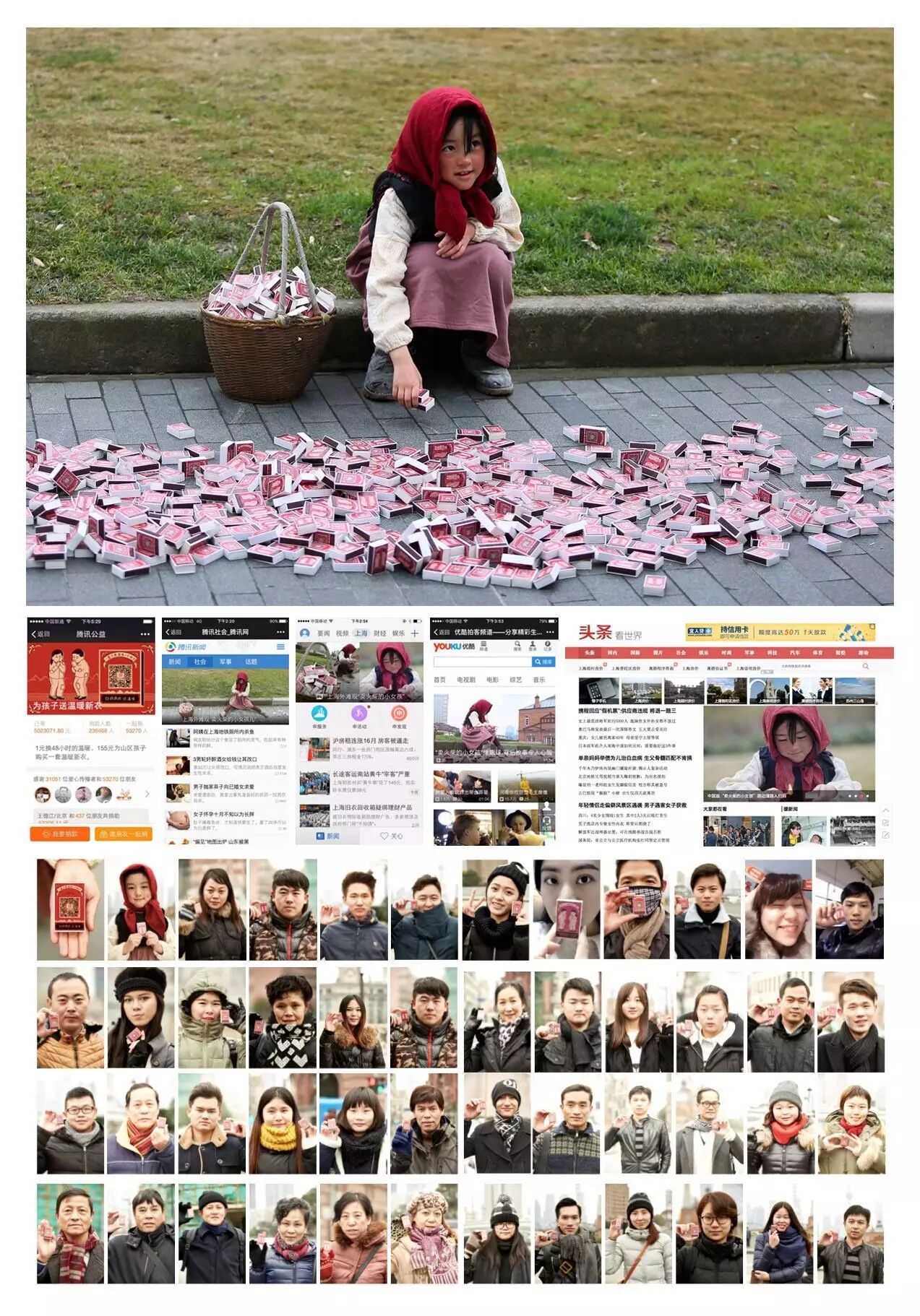 2016年1月,为中国青少年发展基金会“爱心衣橱”基金策划了“卖火柴的小女孩”事件。一个衣衫褴褛的中国小女孩,蹲在街头在凛冽寒风中卖火柴,火柴背面写着“扫码捐款送温暖”。卖火柴的小女孩冒着严寒为山区孩子募捐,一夜之间感动了整个中国,并登上近20家媒体的头条,产生免费媒体报道近300家,免费微信公众号自传播200家,话题讨论超过10万条,影响人群达1.8亿,公益组织募得522万元。其后,在社交网络上,我们再发起“一盒火柴温暖一个孩子”行动,无数网民和卖火柴的小女孩一样,举着火柴出来募捐。