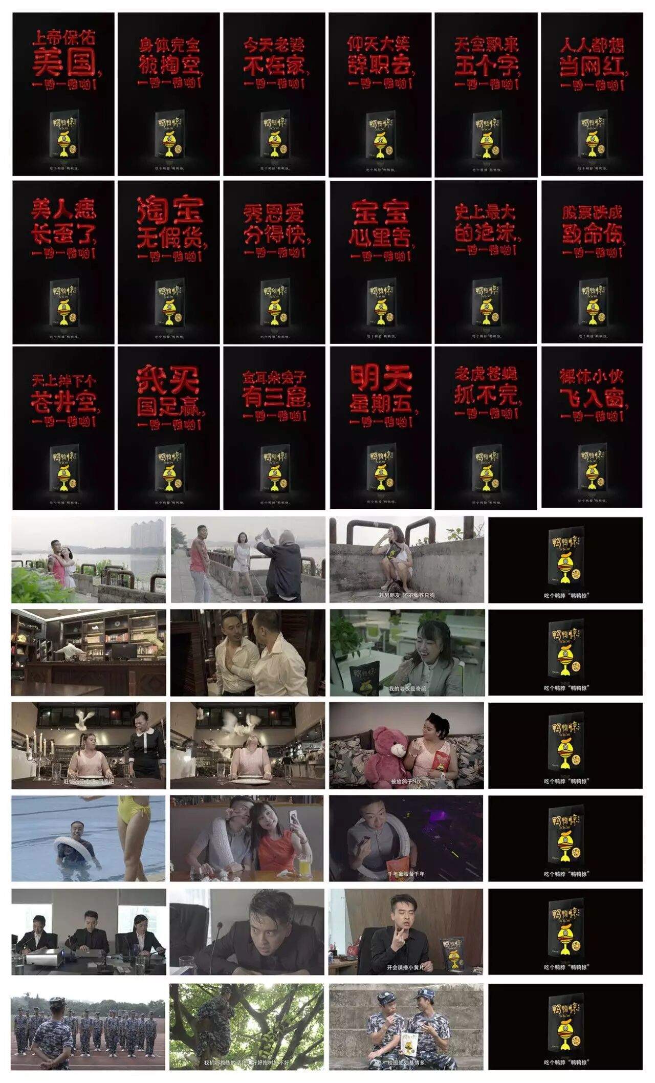 2016年10月,为新晋互联网鸭脖品牌鸭鸭惊提出品牌主张“一鸭一鸭哟”,并推出50张魔性海报和6条病毒视频。每天在微博上PO一张图,一句前半有毒后半又很治愈的话,给很多人输入快乐的正能量,吃个鸭脖让心情像小时候的一句儿歌“一鸭一鸭哟”~~~让人情不自禁就跟着唱起来了。广告推出后,市场反响奇好,被中国广告,4A广告门,营销案例精选等行业媒体冠以“自带音效的平面广告”,“鸭脖界的灵魂导师”,“一鸭一鸭哟哲学”等称谓。在11月8日美国总统大选的一众借势营销中,“上帝保佑美国,一鸭一鸭哟”更被评为获赞最多的热点广告之一。微信上被众多公众号转载,累计产生自传播近400篇,并引发大量网友热议,鸭鸭惊成为鸭脖界最火的品牌之一。