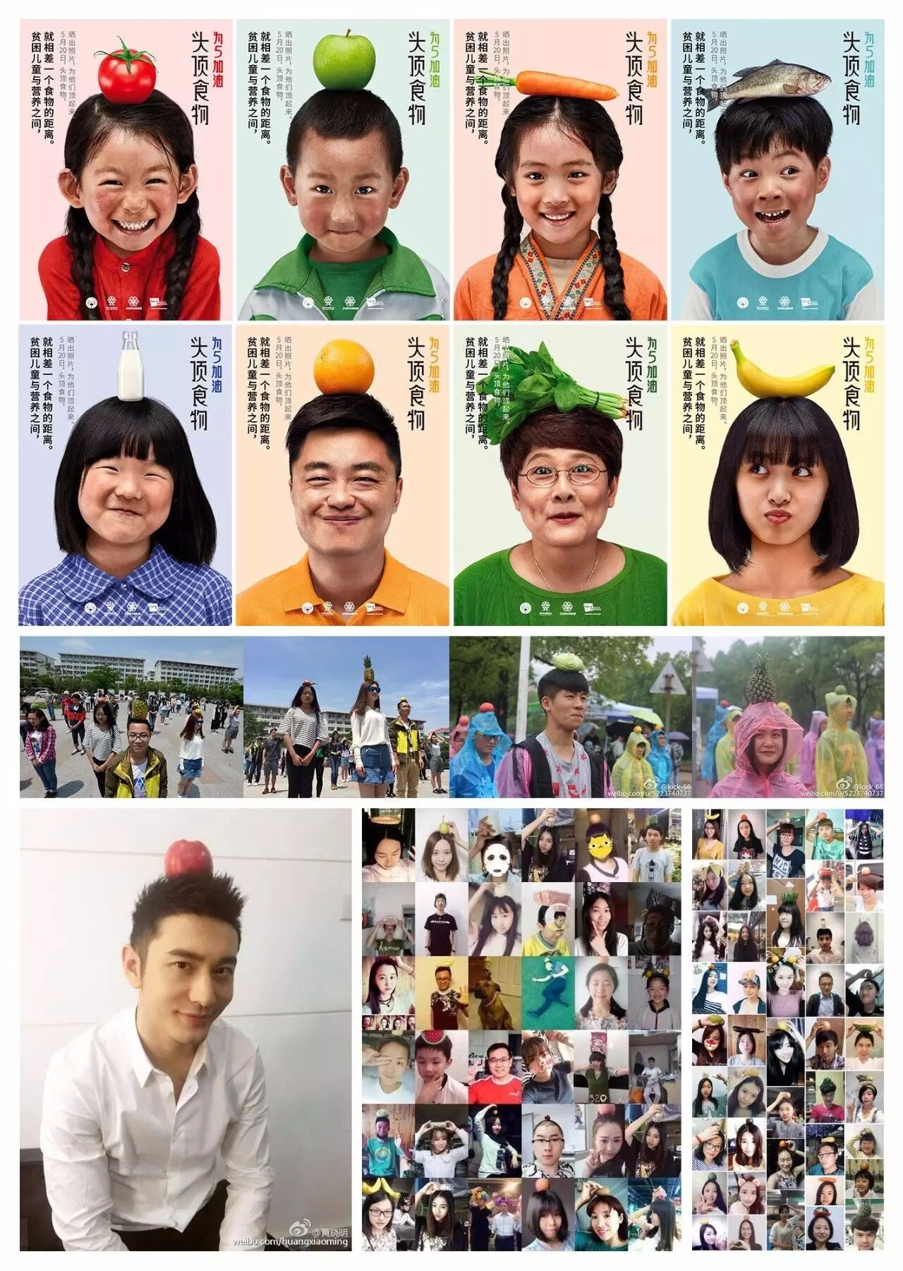 2016年5月20日,为安利公益基金会发起“头顶食物” 行为。贫困儿童与营养之间,就相差一个食物的距离,“头顶食物” 呼吁大家为中国1000万营养不良的贫困儿童顶起来,为他们募捐。在上海松江大学城,百余名大学生排排站,头顶起各种食物。南昌航空航天大学、山东建筑大学的学生们则冒雨头顶食物。著名影星黄晓明、央视主持人文静、90后搞笑博主黄文煜、楚楚街副总裁蒙克等均自发参与。微博上#头顶食物#的话题阅读量突破6000万,长时间占据公益榜第一位。“头顶食物” 共为贫困儿童募集到近100万善款,参与人数超过5万,40余家企业和60余所高校参与其中,更吸引了100多家媒体主动报道,成为又一火爆网络的大事件。
