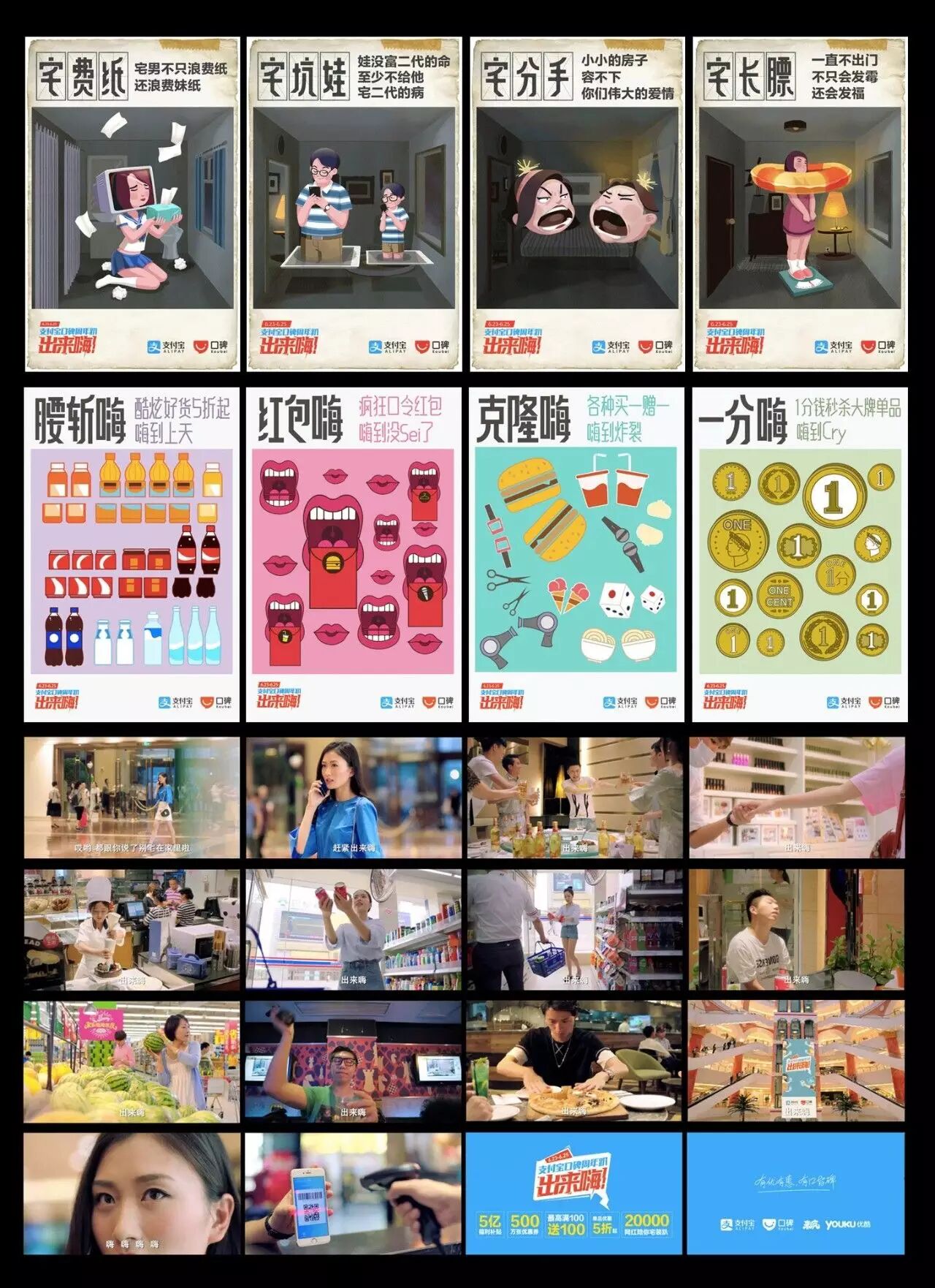 2016年6月,支付宝口碑成立一周年,联合10万商户打造线下消费狂欢节——支付宝口碑周年趴“出来嗨”。第一趴:六张“宅出病”GIF,趣味呈现宅的各种问题,唤起网友出来嗨。第二趴:魔性MV将“出来嗨”主题洗脑式植入公众脑中,不到一周仅线上播放量就达到1000万。第三趴:20000网红线上预热直播引发关注,线下直播“出来嗨”狂欢活动。直播视频展示出不同层次的联动:网红、粉丝和商家,以商场为单位,在餐饮、商超、KTV、丽人美甲等行业开展不同业态联动,最大程度地促进了线下消费。这次活动不仅让2783万名用户走出家门出来嗨,而且完成线下消费5324万笔,累计带动了25亿元消费。6月25日单日交易更突破1121万笔,支付宝口碑由此成为第1个日交易笔数过千万的本地生活服务平台。