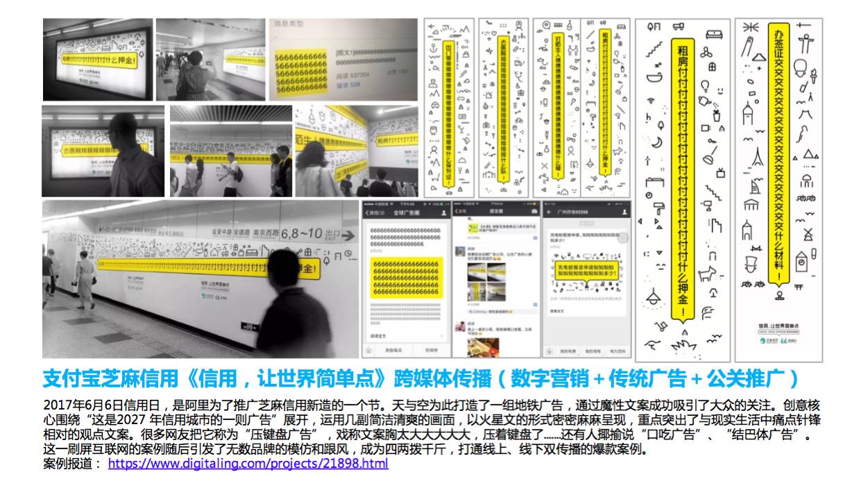 如果我们非要指出小预算获得大传播的营销案例的话,其实我们有不少,比如说卖火柴的小女孩、双十一下雨就免单、今年做的芝麻信用6月6号信用日。这三个案例是通过一些新闻事件,比如说卖火柴的小女孩,双十一下雨就免单这一个话题和起福建芝麻信用日通过一个文案玩了一个新的一种方式。