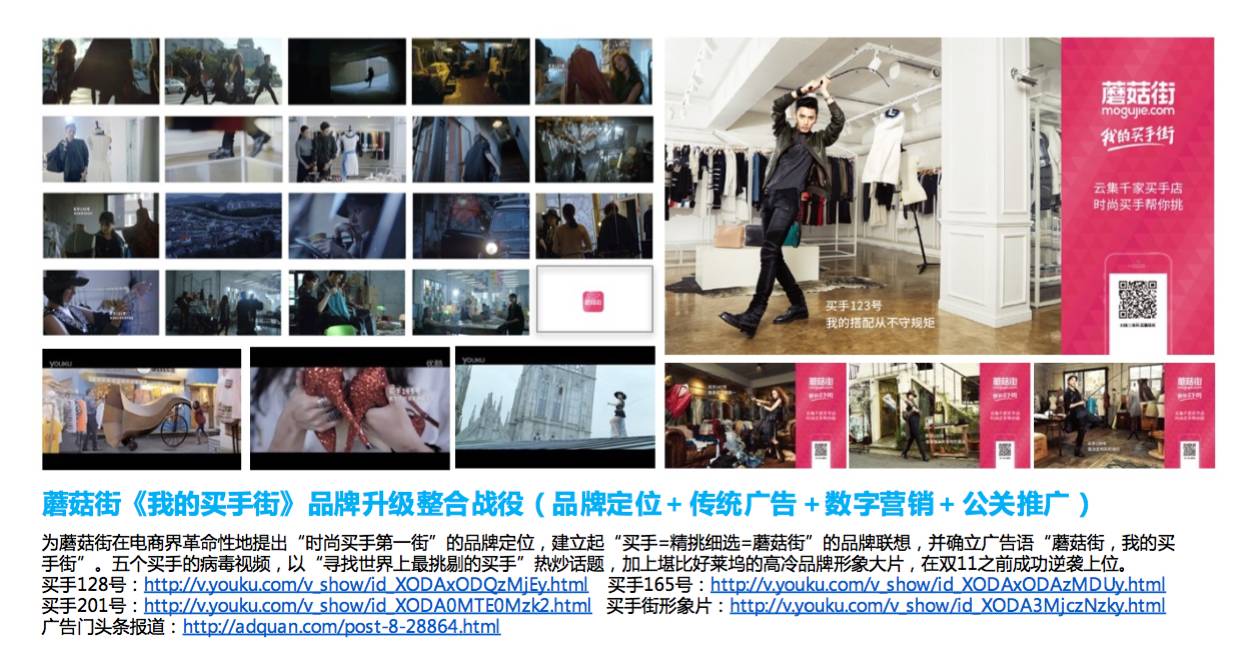 我们做策略其实是比较简单的,不会像那种策略公司或者定位公司写个几百页。那我们当时做这个大概就是花了三五页去推导了一下,然后就把这句话卖掉了。当时就想我们是一个汇聚了几万家品牌旗舰店的平台,就像美国的第五大道,上海的南京路,日本的秋叶原,巴黎的香榭丽舍大道。如果是这么大的话就相当于八个纽约第五大道,相当于十多个香港的铜锣湾,是非常琳琅满目的一个地方。那把他这个汇聚了几万家品牌旗舰店于一体的网上购物平台,翻译成八个纽约第五大道或是十几个铜锣湾,那大概就是把它形象化了。那我们再在往下面推一下,就感觉像你上天猫就够了,别的地方都不用去了。我记得当时我们写了好几句,第一句话是“上天猫 就对了”,第二句是“上天猫 就够了”,第三句就是“上天猫 就购了”。然后我还记得那时候拿了这样三句话就找我那时候的ECD 去讨论到底用哪句话比较好。