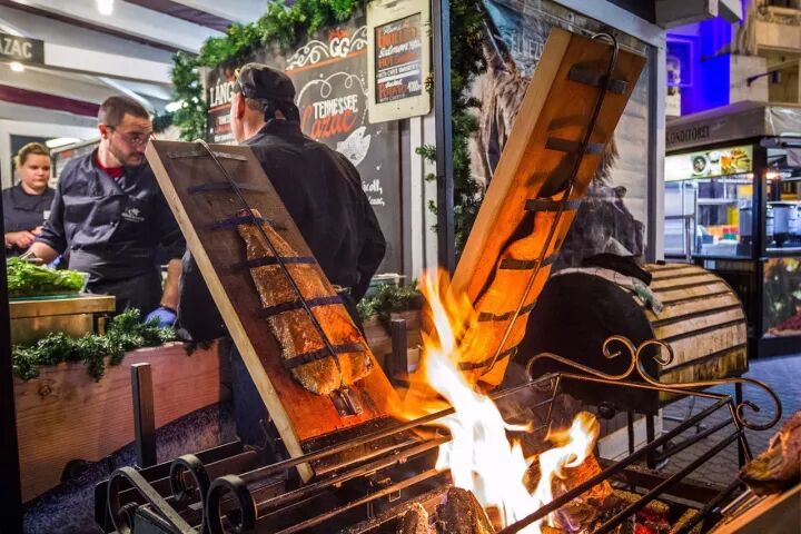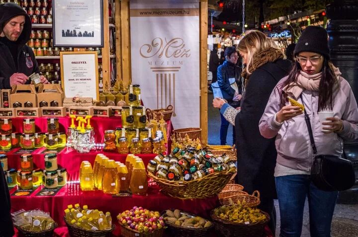 在圣诞集市上您不仅可以品尝到蜂蜜小甜饼、传统的犹太人蛋糕、烤鹅腿、烤猪肘、烤肠、匈牙利牛肉汤、烟囱蛋糕、红红辣椒羊腿三明治、鸡肉意面,还可以品尝品尝匈牙利甜酒和热茶。更值得一提的是,每年圣诞节都会有一款专门设计的圣诞马克杯。在特制的杯子里装上暖暖的甜酒,喝下去的不仅仅是美酒,更是节日的韵味。在圣诞集市上,您还会看到各种美食的现场制作过程。