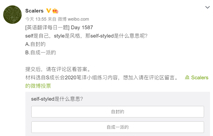 对了近期我在微博上开始发英语每日一测,欢迎来答题,顺便学英语。详情关注我的微博@Scalers