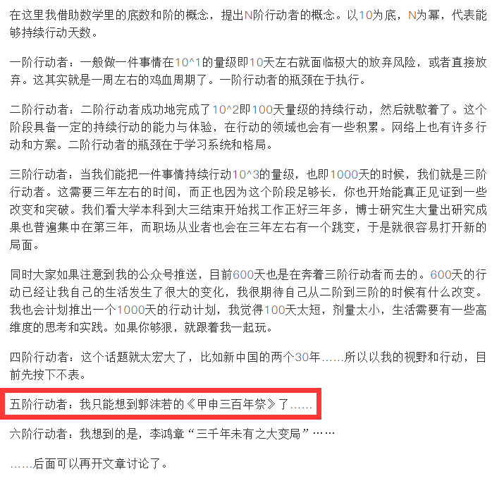 更不要说关于100000(300年)持续行动的问题,甚至很多个人成长博主都看不出这个时间尺度与个人成长有什么关系。