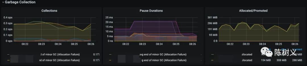 Garbage Collection 展示 JVM 的垃圾回收情况,主要包括垃圾回收频率(ops 表示一秒回收几次,一般 0.5 是比较合理的值)、每次 GC 停顿时长(一般 80ms 以下是合理值)、分配到新生代/晋升老年代的内存。