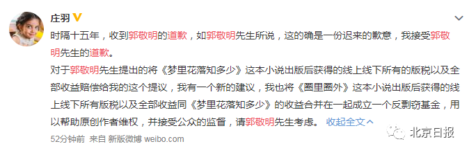 上午8时许,庄羽回应道歉称:“对于郭敬明先生提出的将《梦里花落知多少》这本小说出版后获得的线上线下所有的版税以及全部收益赔偿给我的这个提议,我有一个新的建议,我也将《圈里圈外》这本小说出版后获得的线上线下所有版税以及全部收益同《梦里花落知多少》的收益合并在一起成立一个反剽窃基金,用以帮助原创作者维权,并接受公众的监督,请郭敬明先生考虑。”