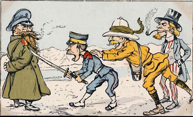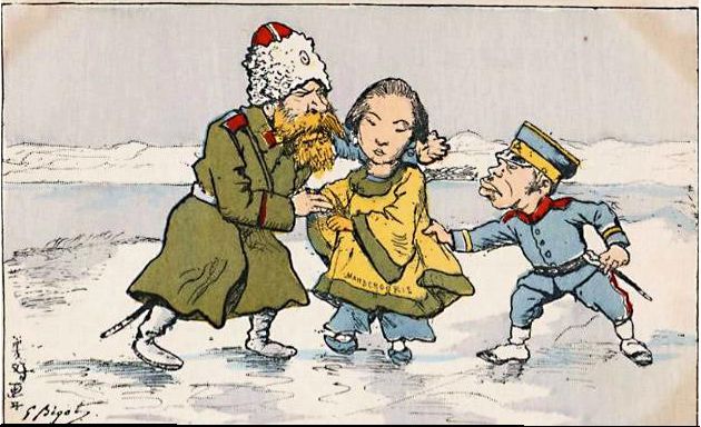 该图为日俄战争前或中,俄国的宣传画(俄国被描述为正义和弱者的守护者)