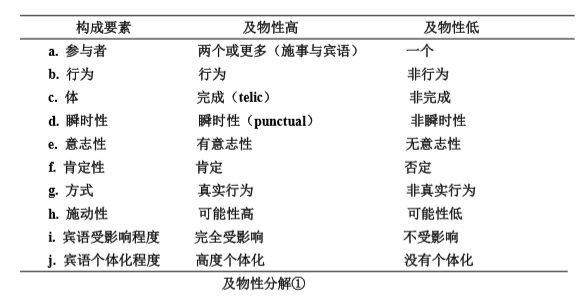 所谓及物性,原先指的是动词的及物或不及物。后来Hopper & Thompson根据10个要素的实现状况来区分及物性的高低。