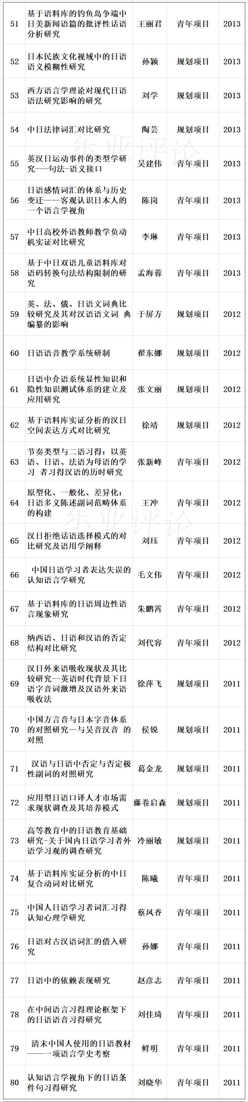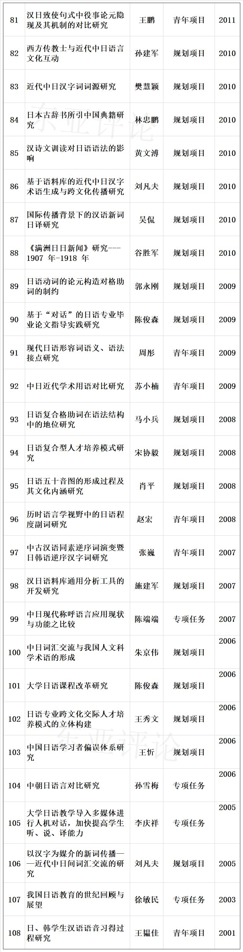 近期,教育部人文社科项目开始申报,年底则是国家社科基金等项目。为了使国内从事日本研究的学者们申报课题能在选题方向上有所借鉴,东亚评论公众号近期将定期推送近20年国家社科项目、教育部人文社科项目各主要学科中日本学相关课题立项情况,希望能为各位申报课题提供有益的参考,敬请持续关注。