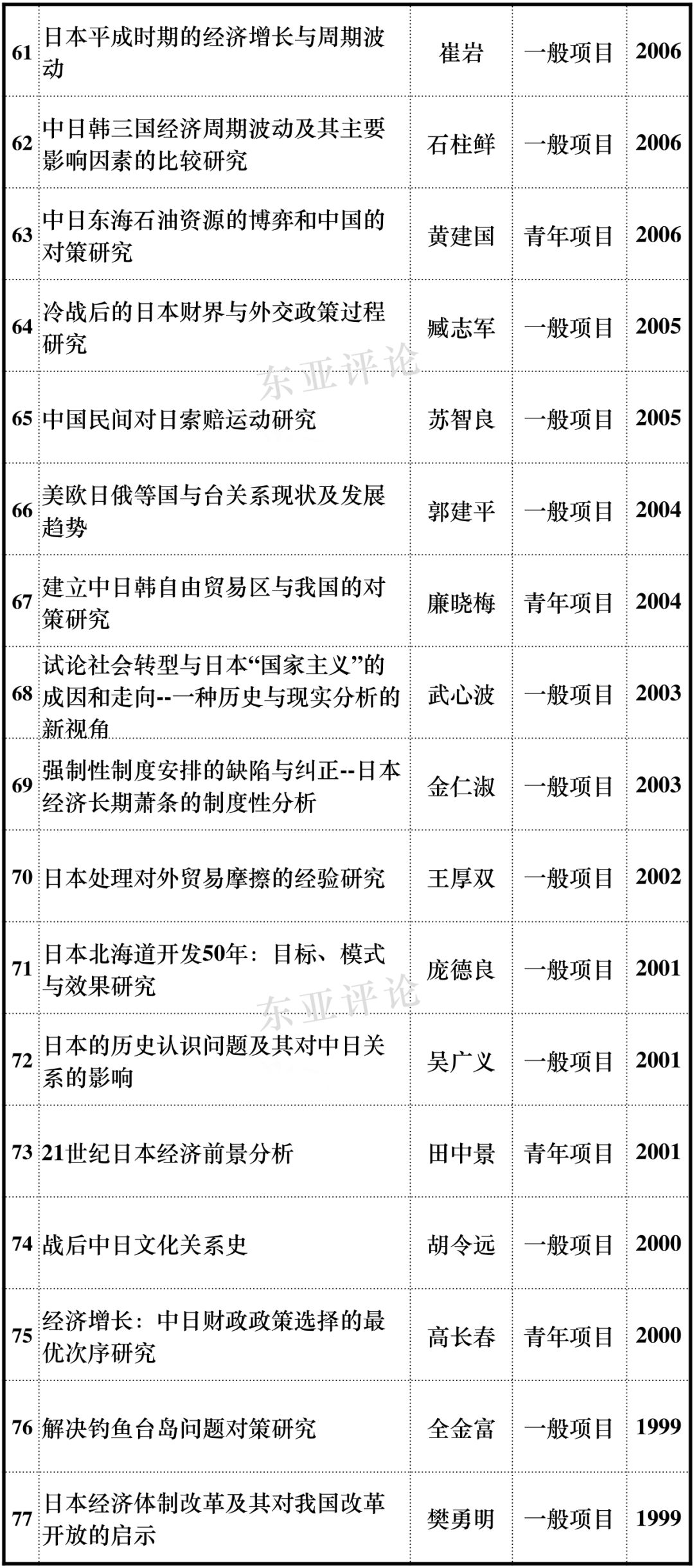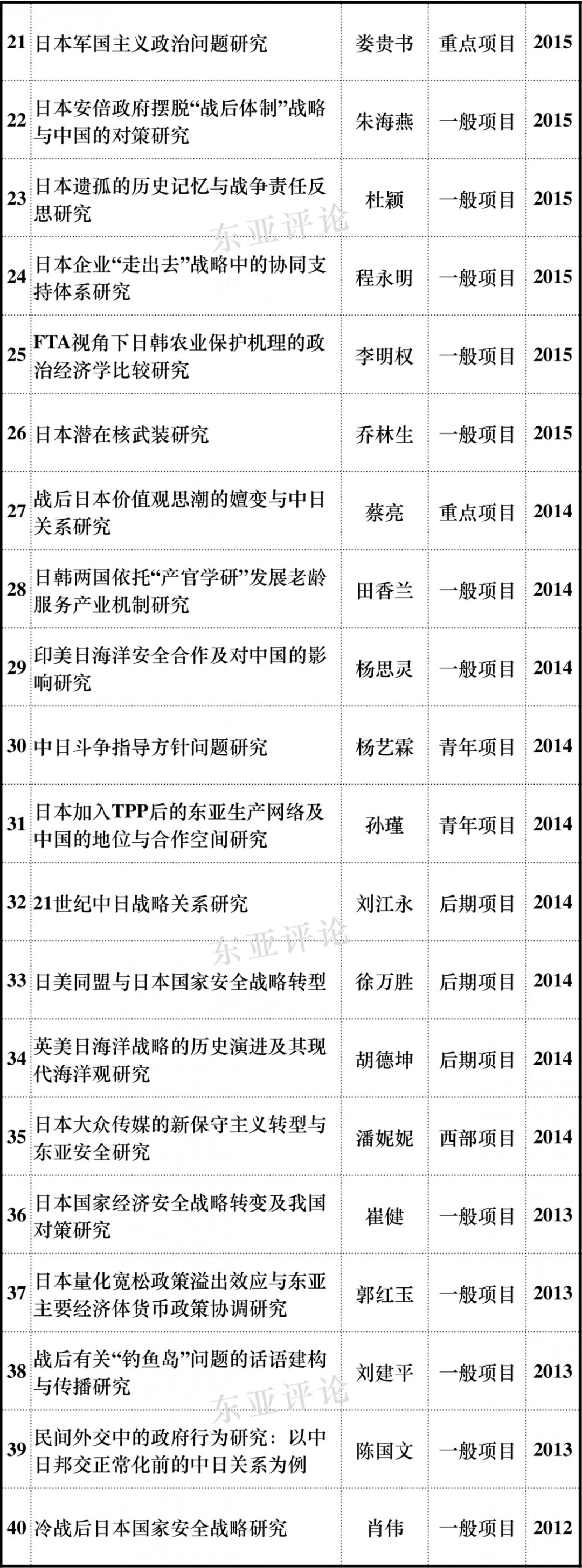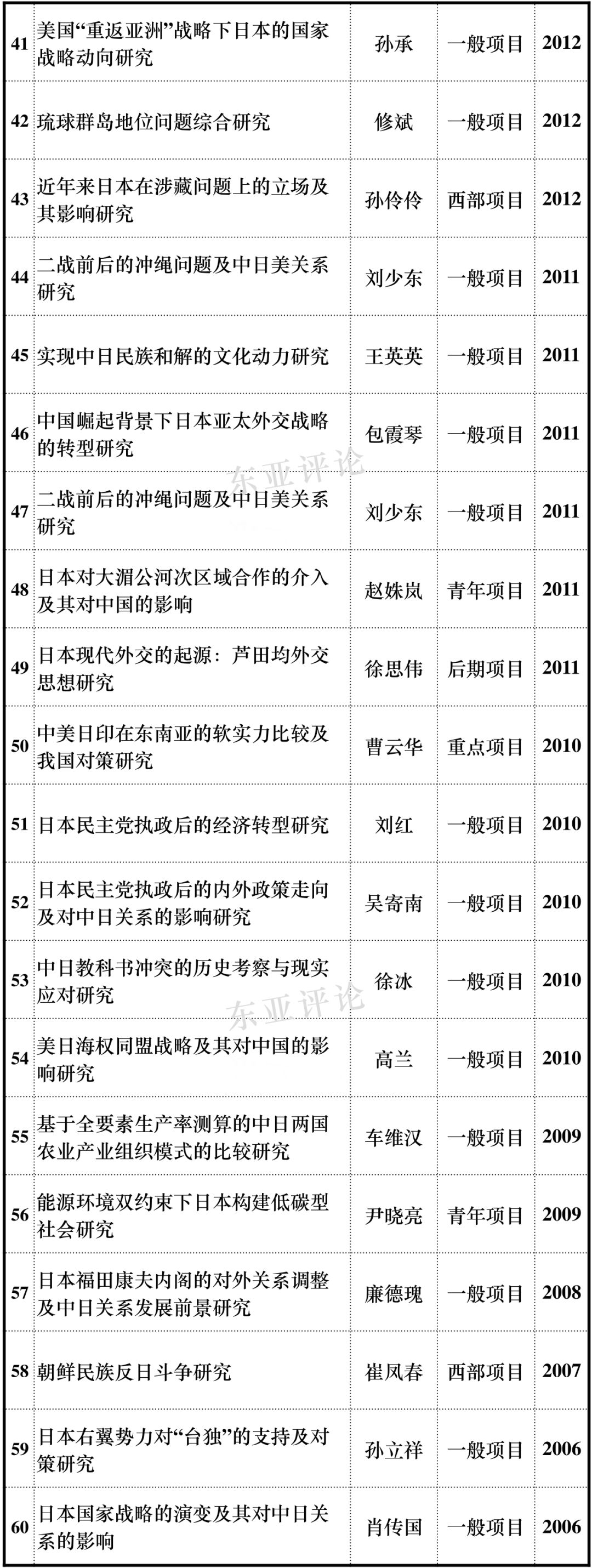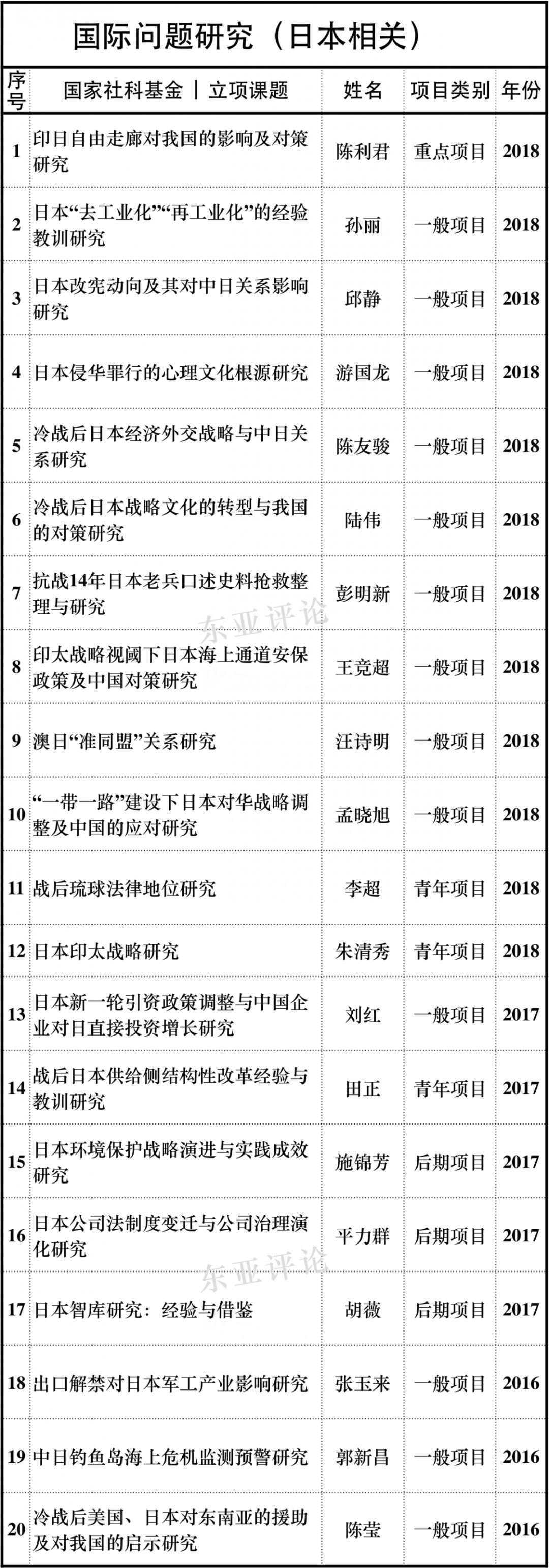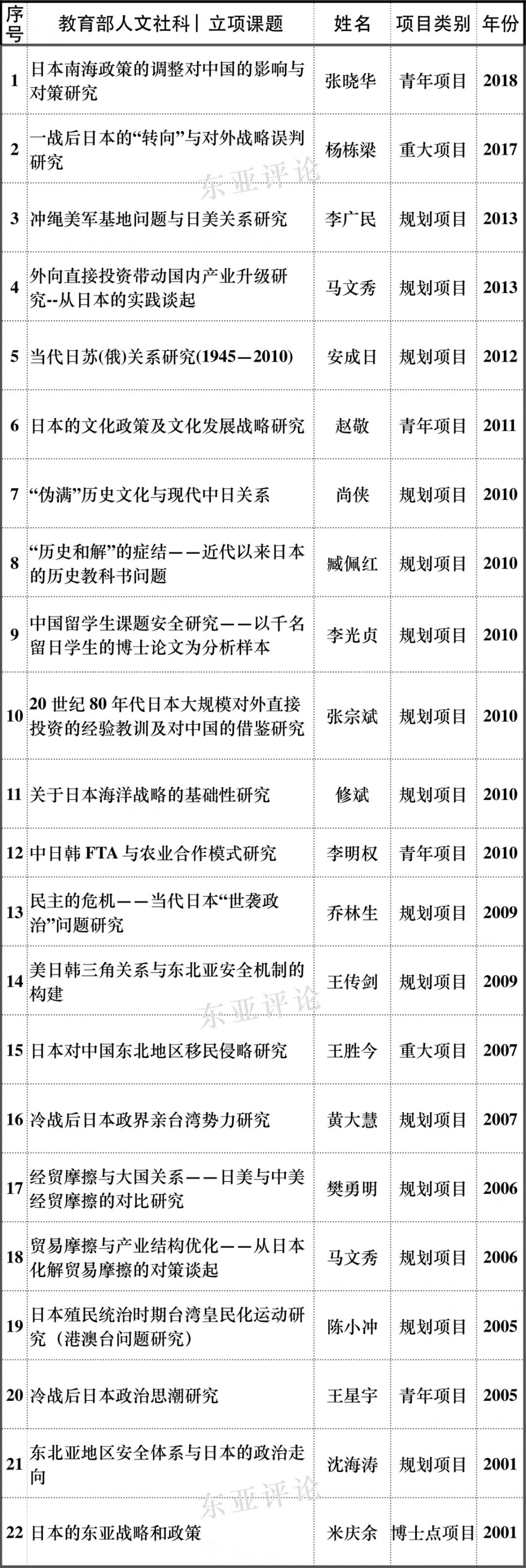 近期,教育部人文社科项目开始申报,年底则是国家社科基金等项目。为了使国内从事日本研究的学者们申报课题能在选题方向上有所借鉴,东亚评论公众号近期将定期推送近20年国家社科项目、教育部人文社科项目各主要学科中日本学相关课题立项情况,希望能为各位申报课题提供有益的参考,敬请持续关注。