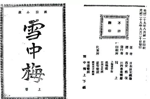 《雪中梅》一书的书名早见于康有为的《日本书目志》(1898),但我们现在知道该书目只是依据当时的日本发行的数目对其重新编辑的结果,故并不能说明其在中国的利用状况。确凿可知的中文译本有光绪二十九年(1903)由江西尊业书馆发行的上下两册。该译本的问世比日文初版晚十六年,比增补本也要晚十一年,这一点是跟上述译著与原著的时代相隔是一致的。