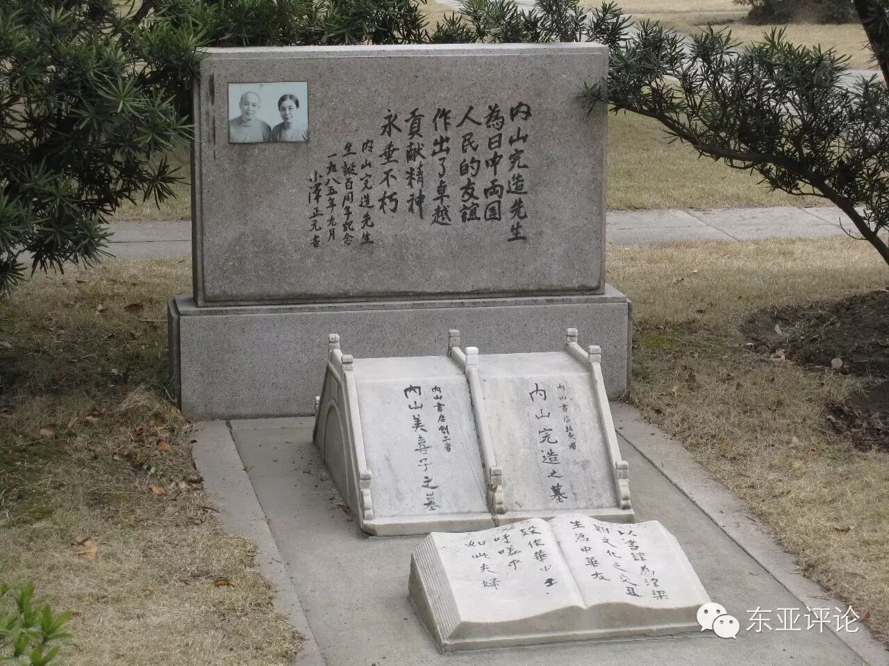 当年内山美喜去世后,内山完造为自己和夫人在万国公募置下了夫妻合葬墓。内山完造去世后,遗骨便安放在这座为老板夫妇专门设计的合葬墓里。内山夫妇之墓的造型十分独特,墓碑前有一座象征友好交往的中式拱桥,拱桥前是一本翻开的书籍,书上的文字,由老板的老朋友夏丏尊题写:“以书肆为津梁,期文化之交互。生为中华友,殁作华中土。吁嗟乎,如此夫妇。”夏丏尊的题词,是对内山书店作为中外文化交互之桥梁的历史贡献的准确写照。