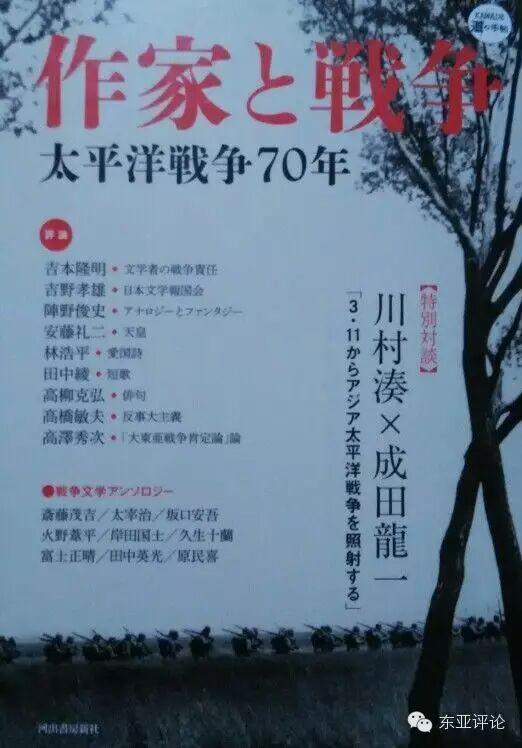 在3•11东日本大地震之后的一个月左右的4月15日,川村凑与成田龙一展开了有关战争文学的第三次对谈,标题为《3•11照射下的亚洲太平洋战争》,将3•11和战争灾难联系在一起,其实灾后很多文学家和评论家都做了类似的连接和分析。在这篇对谈中二位学者从战争文学出发对战后的冷战体制做了深入的思考。