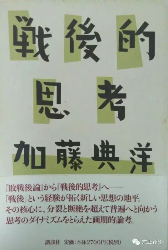 20世纪末的90年代以来,冷战结束。“后冷战时代最大的特征是直接固化了冷战遗产,人类失去了清理冷战基础及其遗产的机会,使得依托殖民主义遗产而来的冷战本身所制造的诸多世界难题全部遗留下来。”[2]78战争因素不但没有消失,相反,随着东海石油开发、钓鱼岛、修改宪法第九条等一系列事件,战争论”“战后论”再次成为思想文化、文学的焦点。藤冈信胜和自由主义史观研究会《教科书不教的历史》(产经新闻news service,1996),小林善纪(小林よしのり)《新 傲慢主义宣言 special 战争论》(1998 ,幻冬舍)成为畅销书。小林的“战争论”沿袭了林房雄的大东亚战争肯定论。加藤典洋(1948- ),日本文艺评论家。1997年发表著作《败战后论》。他承认日本的侵略责任,但认为由于战败,战后日本人陷入“人格分裂”,为了接受日本的战后责任,最先应克服这种人格分裂,要“从内部打开”,首先建立“我们日本人”这个国民主体,为此要先哀悼日本的三百万死者,然后再哀悼亚洲的两千万死者。高桥哲哉等学者认为加藤的“败战后论”体现了20世纪90年代以来日本的一种新民族主义观,使得历史认知问题日趋复杂。
