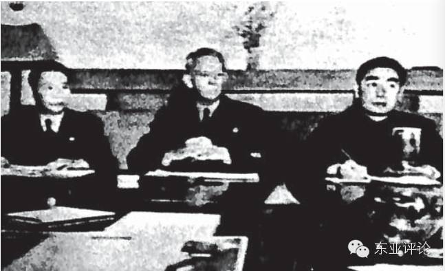 (1945年12月27日,美国代表马歇尔、中国共产党代表周恩来、国民党代表张群三人会谈。)