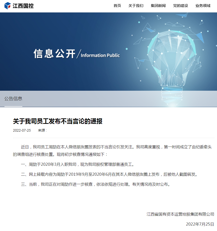 江西省国有资本运营控股集团有限公司官网25日通报:近日,我司员工周劼在本人微信朋友圈发表的不当言论引发关注。我司高度重视,第一时间成立了由纪委牵头的调查组进行核查处置。现将初步核查情况通报如下: