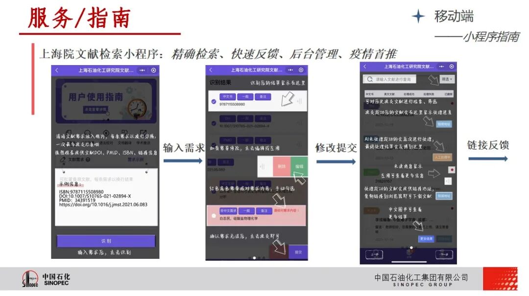 面对科研人员对文献调研的迫切需求,情报部第一时间与数据供应商沟通,设计推出了“上海石油化工研究院文献服务平台”小程序,实现了对多种类型文献精准检索下的24小时自动传输和自主文献获取。同时,为实现专利检索和下载,情报部积极采用各种方式解绑IP段限制,实现了居家使用智慧芽等数据库,满足了科研人员的专利数据需求。