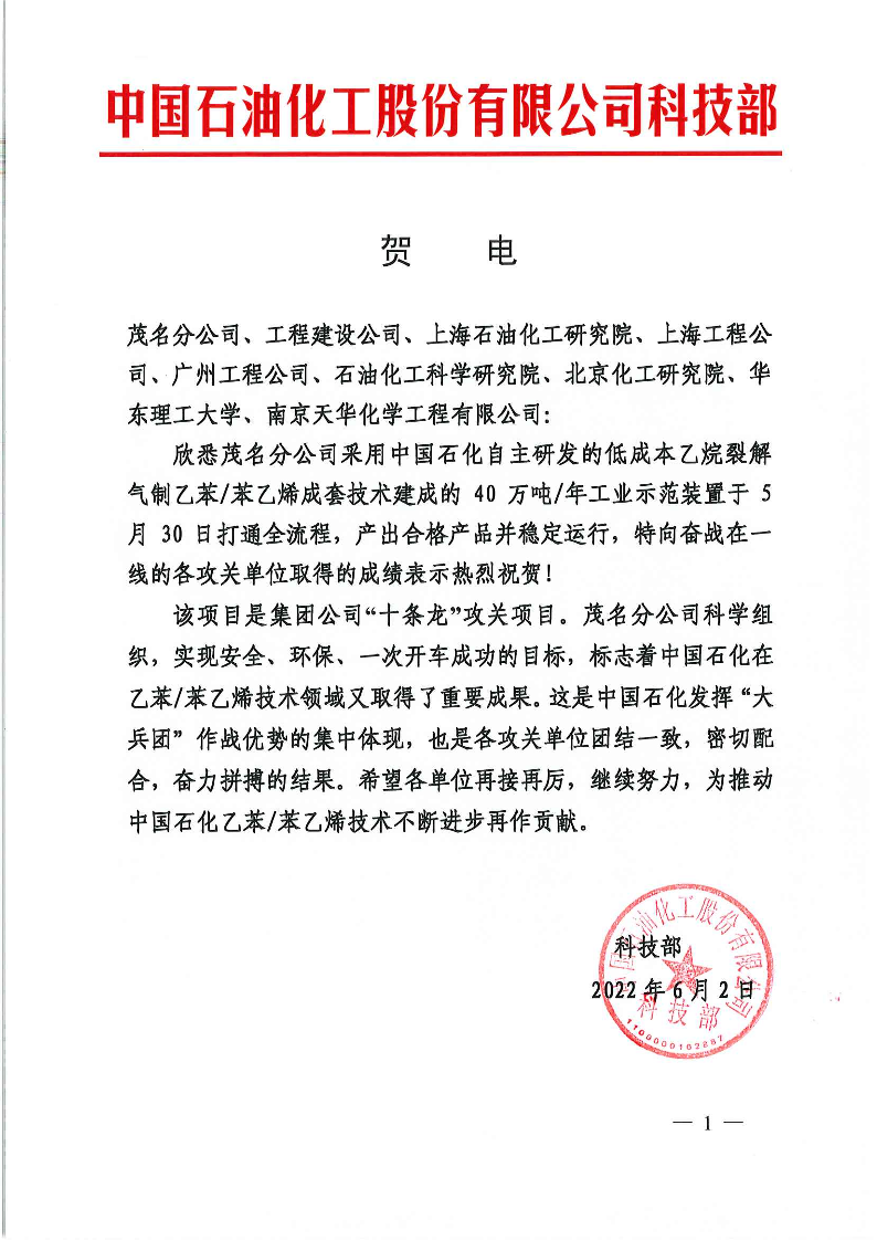 5月30日,中国石化“十条龙”科技攻关项目“低成本乙烷裂解气制40万吨/年苯乙烯成套技术开发”装置在茂名石化一次开车成功。集团公司科技部发来贺电,对开车成功和各单位取得的成绩表示热烈祝贺!