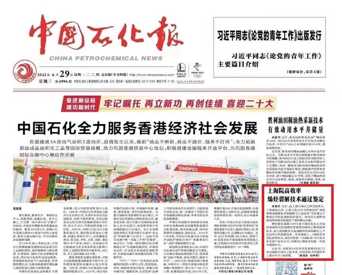 近日,上海院高收率烯烃裂解技术通过了集团公司科技部组织的鉴定。《中国石化报》头版、《中国化工报》、中国石化新闻网、中国石化手机报对此进行报道。