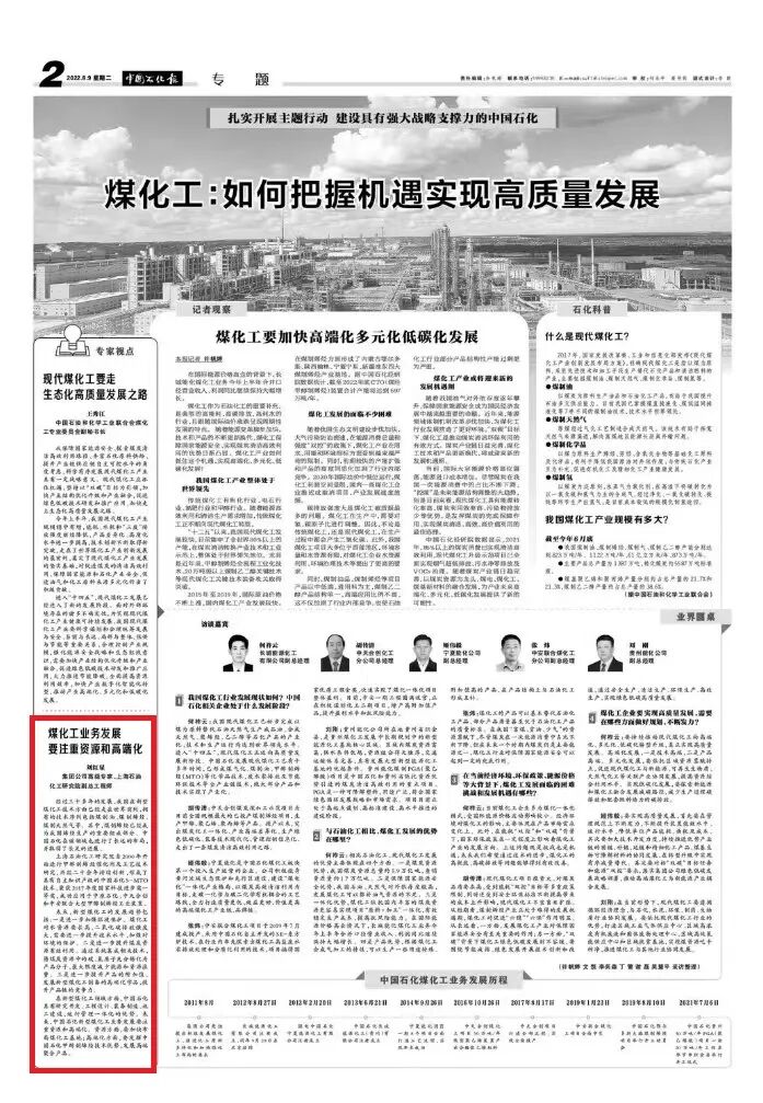 近日,《中国石化报》“扎实开展主题行动 建设具有强大战略支撑力的中国石化”专栏发表中国石化高级专家、上海院副总工程师刘红星关于煤化工产业的建言文章《煤化工业务发展 要注重资源和高端化》。