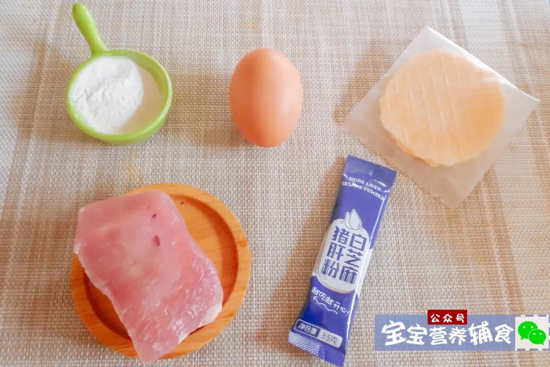 食材:猪肉80克、玉米淀粉20克、鸡蛋1个、三文鱼虾片适量、猪肝粉适量