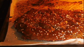 10分钟后,取出来在肉脯表面刷上蜂蜜,撒上白芝麻。